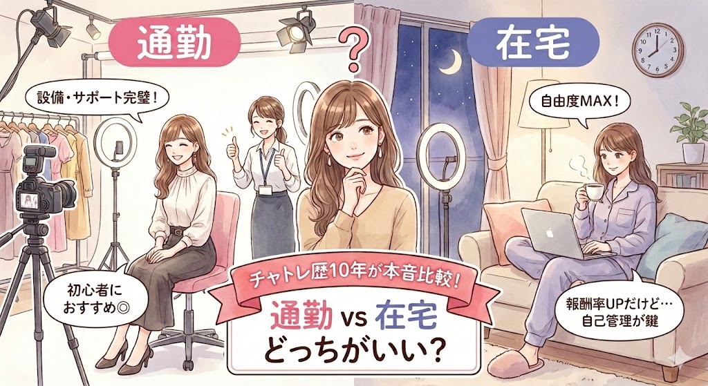 チャトレを始めようと思った時、最初に迷うポイントだよね。この記事では、10年間で両方経験した私が、それぞれのメリット・デメリットを本音で比較します。