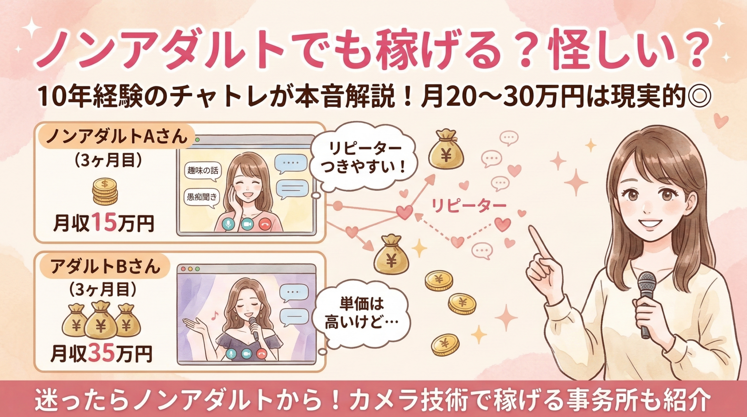 数字だけ見るとアダルトの方が稼げそうに見えるけど、ノンアダルトの方がリピーターがつきやすいのが大きなメリット。常連さんがつけば安定収入になるし、精神的な負担も少ないから長く続けられる。